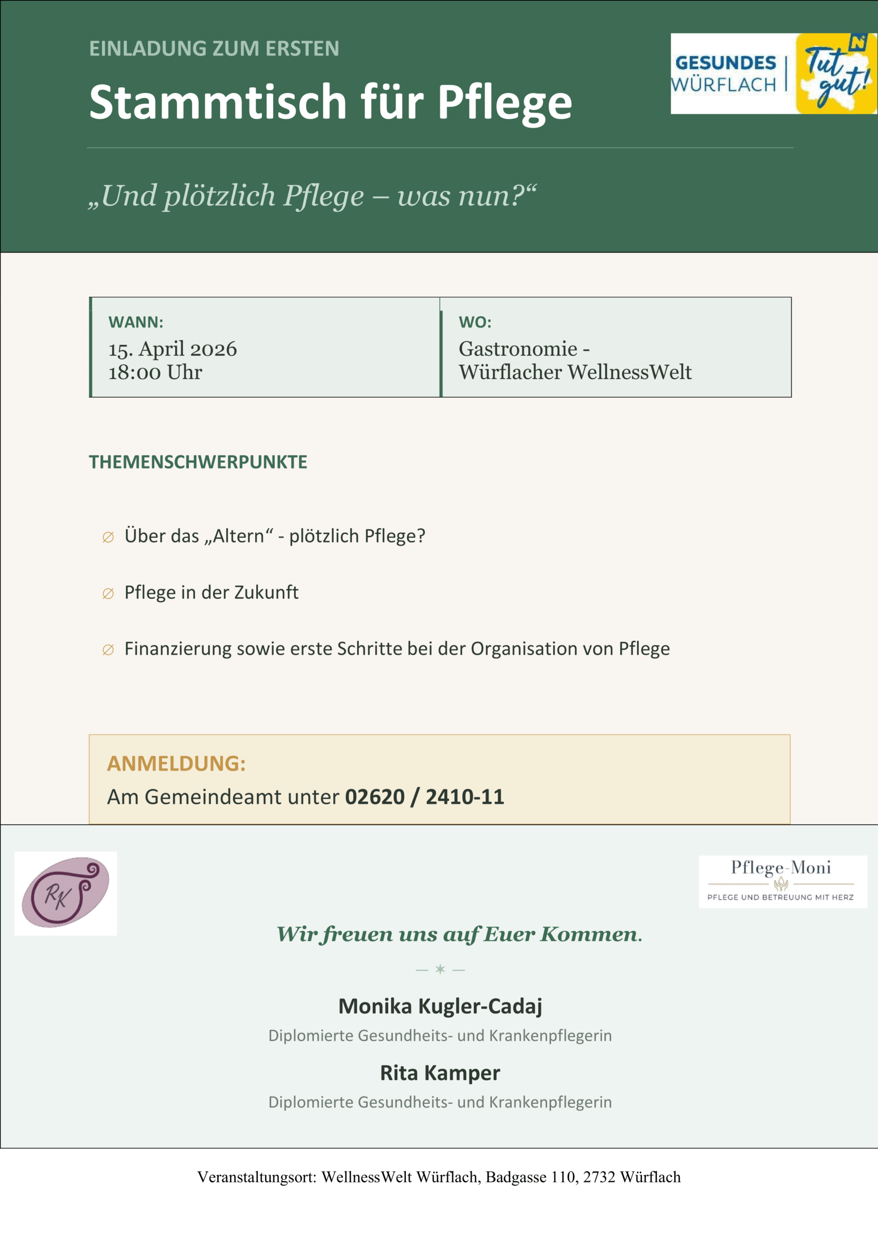 Um Orientierung zu geben und rechtzeitig auf zukünftige Herausforderungen vorzubereiten, laden wir Sie zum Stammtisch für Pflege ein.